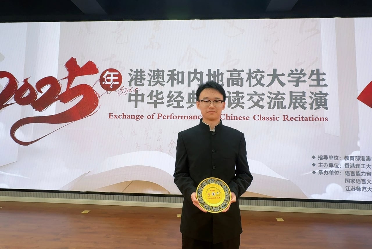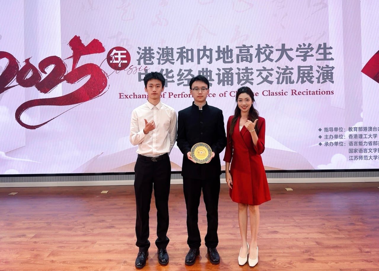 在教育部港澳臺辦公室的支持下,江蘇師範大學、香港理工大學和澳門大學聯合主辦的2025年港澳和內地高校大學生中華經典誦讀交流展演決賽於9月25日在江蘇師範大學舉行。本次活動共收到了來自全國逾百所高校的300部作品,有50部最終入圍展演環節。由澳科大人文藝術學院副院長、文體發展辦公室主任、藝術團總監蔣瀟玲博士及通識教育部講師、藝術團司儀隊教練藍小然擔任指導教師,藝術團司儀隊叢翔的朗誦作品《出師表》、洪梓霖的朗誦作品《狂人日記》及李藍的朗誦作品《月光下的中國》脫穎而出,順利入圍全國展演階段。最終,叢翔晉級決賽並躋身全國十強並榮獲最佳舞臺表現獎。