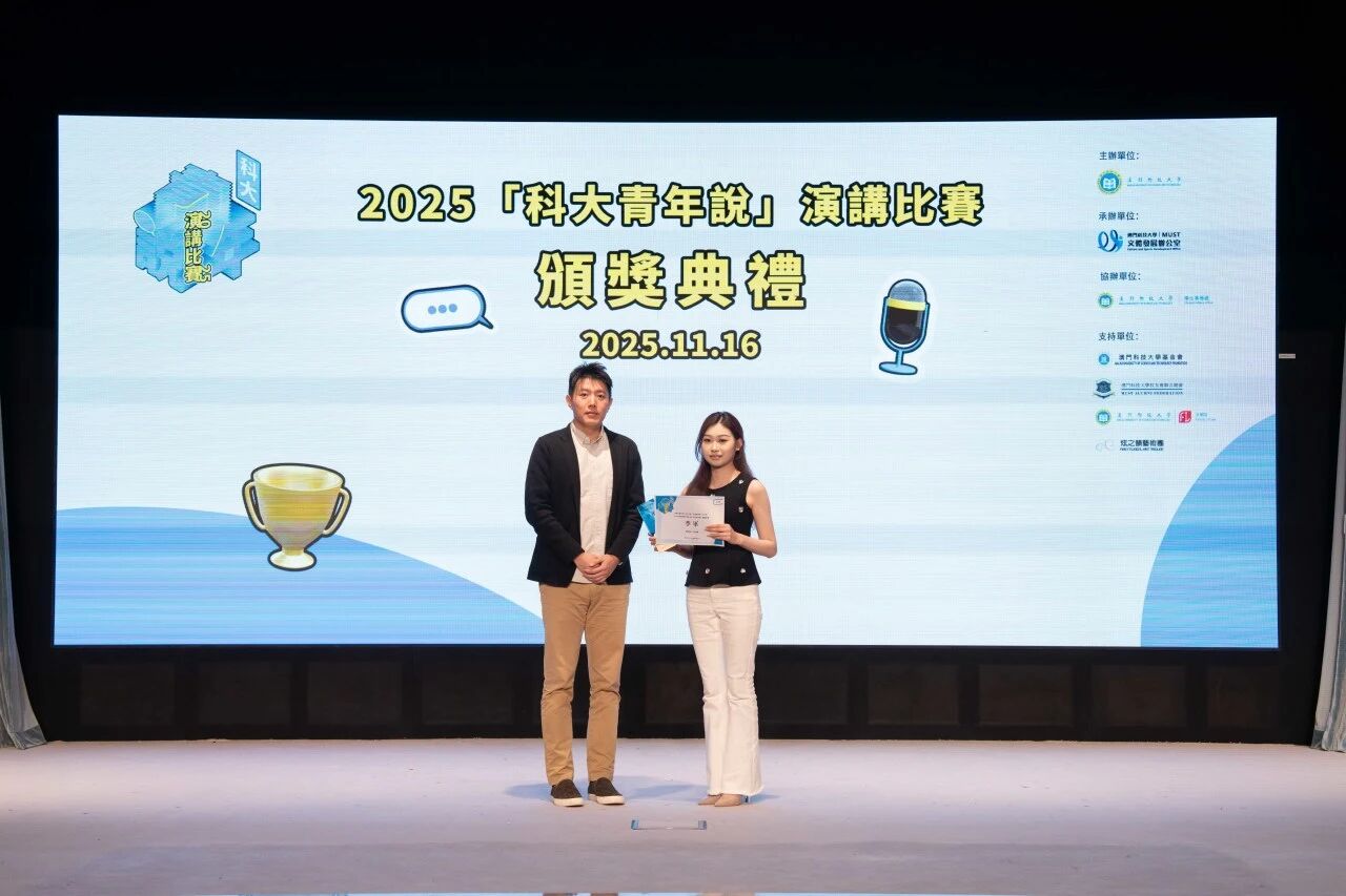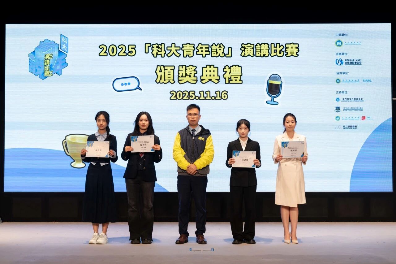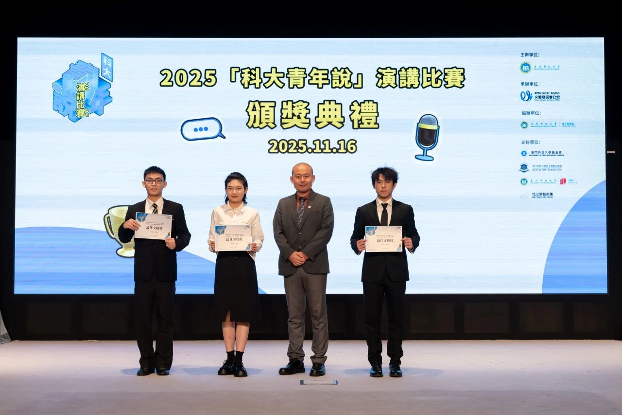 由澳門科技大學主辦、文體發展辦公室承辦、學生事務處協辦,澳門科技大學基金會、澳門科技大學校友會聯合總會、澳門科技大學法學院、炫之韻藝術團共同支持的 2025「科大青年說」演講比賽決賽,於 2025 年 11 月 16 日在澳門科技大學 D 座禮堂順利舉行。