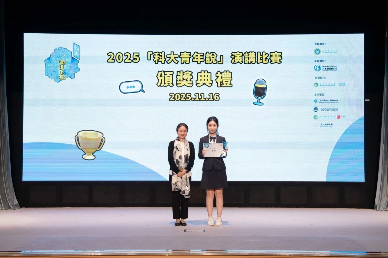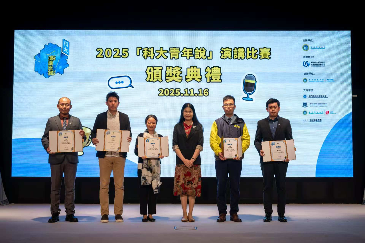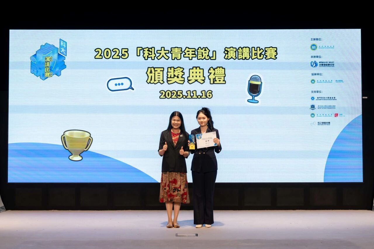 由澳門科技大學主辦、文體發展辦公室承辦、學生事務處協辦,澳門科技大學基金會、澳門科技大學校友會聯合總會、澳門科技大學法學院、炫之韻藝術團共同支持的 2025「科大青年說」演講比賽決賽,於 2025 年 11 月 16 日在澳門科技大學 D 座禮堂順利舉行。