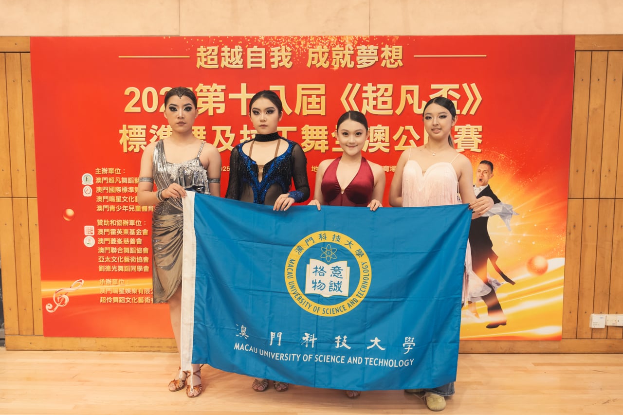 由澳門超凡舞蹈藝術學會、澳門國際標準舞總會、澳門青少年兒童體育舞蹈協會與澳門鳴星文化藝術協會合辦的 2025 第十八屆《超凡盃》標準舞及拉丁舞全澳公開賽於 11 月 30 日在澳門關閘工人體育場 A 館順利舉行。本屆《超凡杯》彙聚來自海峽兩岸暨港澳地區的優秀舞蹈選手,競爭激烈,吸引了約 350 名選手參與。澳門科技大學國標舞蹈隊共派出 4 名同學參賽,參與公開業餘組、公開高等院校組等多個拉丁舞項目,榮獲多項獎項,展現出澳科大學子的青春風采。