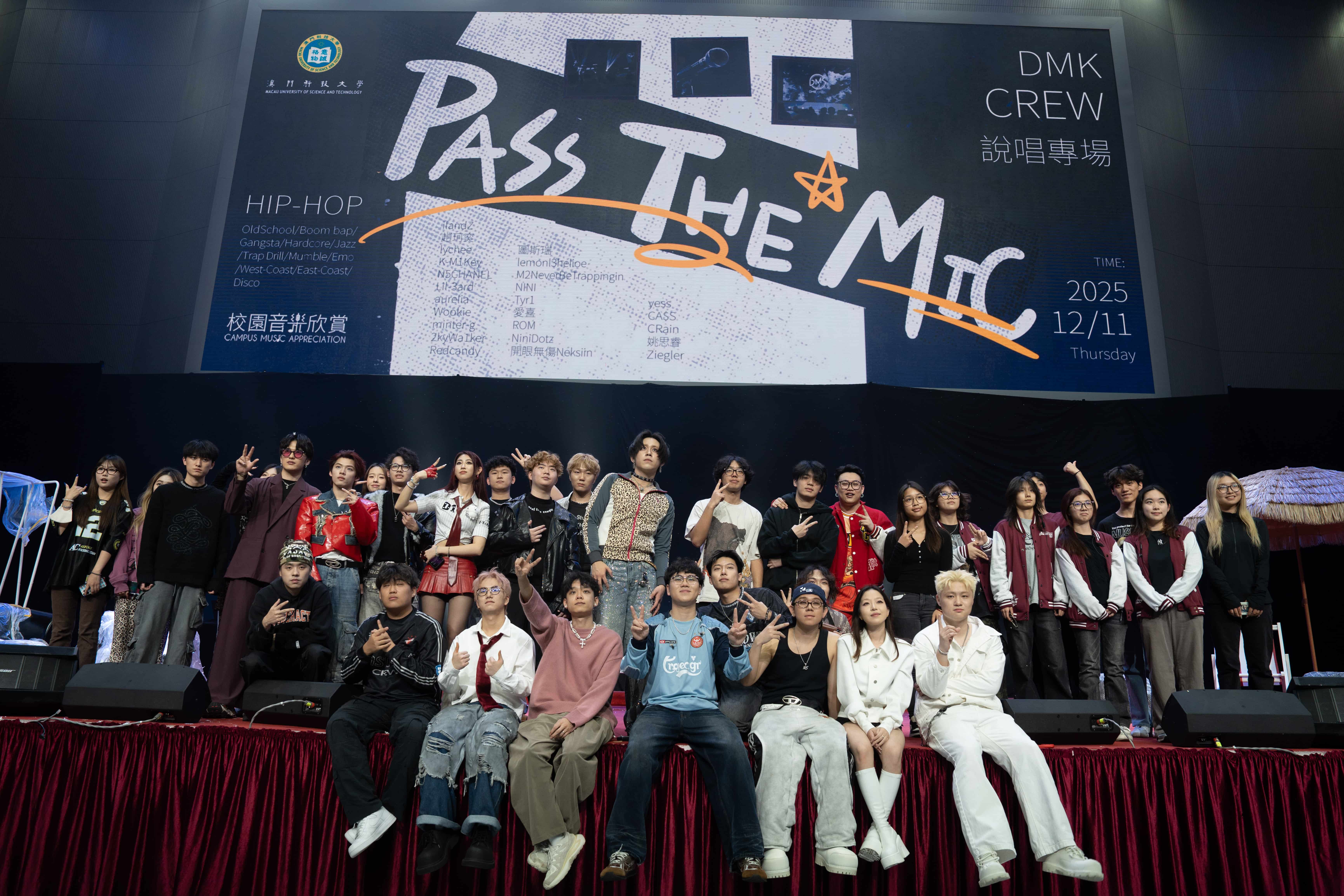 由澳門科技大學文體發展辦公室主辦,澳門科技大學基金會、澳門科技大學校友會聯合總會以及炫之韻藝術團支持的校園音樂欣賞之説唱專場「Pass the Mic」,於 2025 年 12 月 11 日晚七時在澳門科技大學 R 座綜藝廳順利舉行。