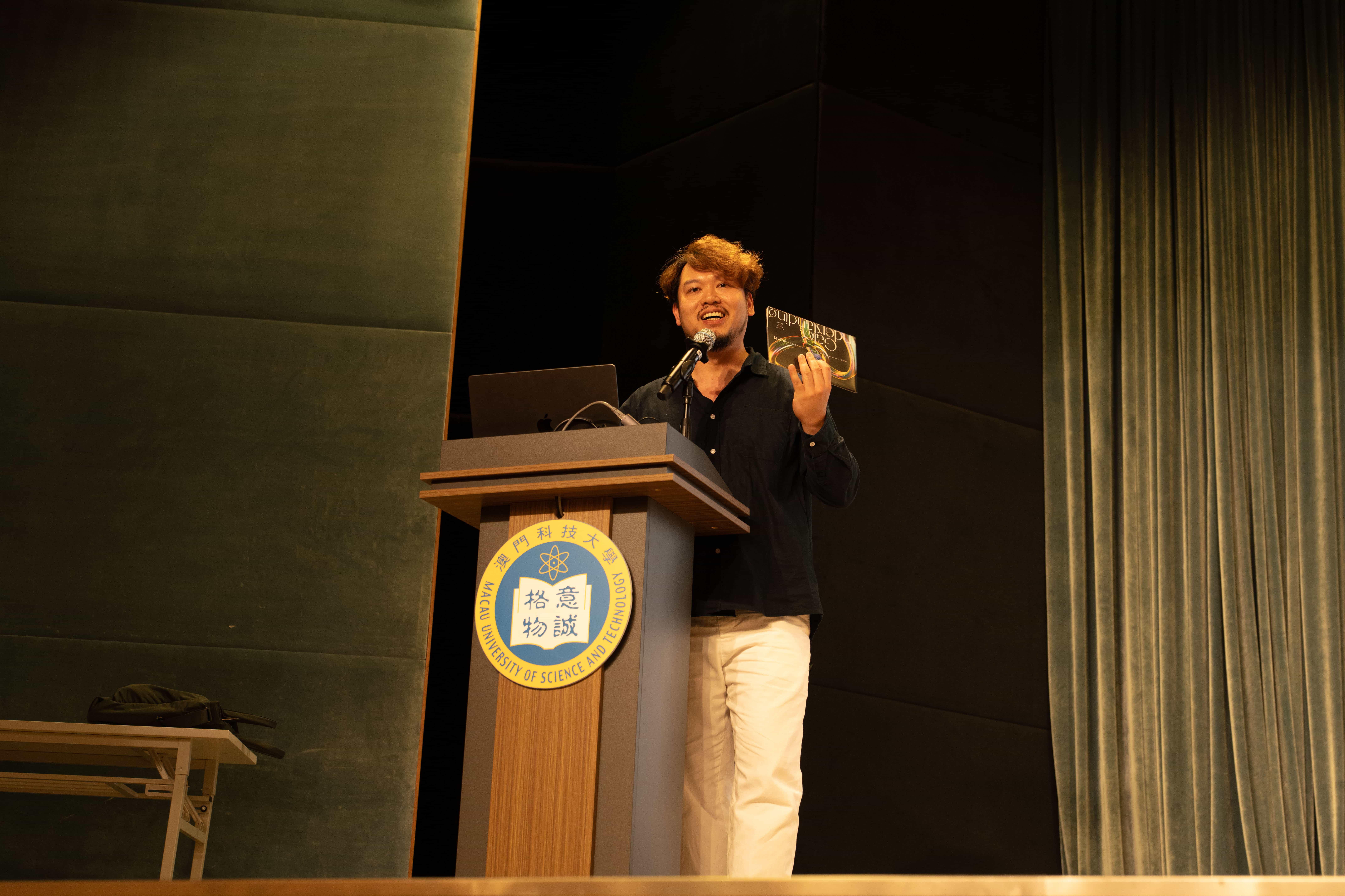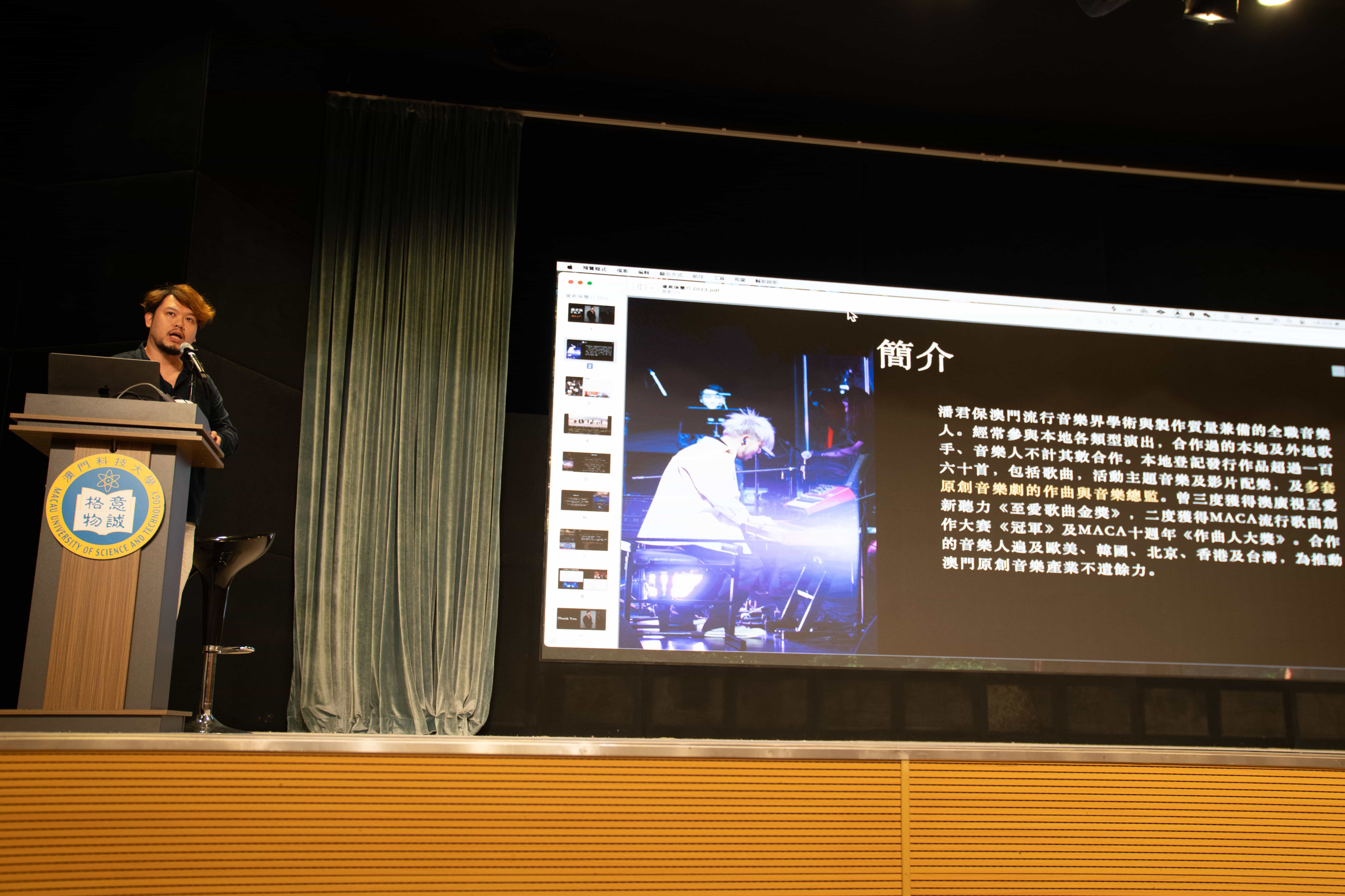 由澳门科技大学文体发展办公室主办,澳门科技大学基金会、澳门科技大学校友会联合总会、炫之韵艺术团支持的「艺术大讲堂」系列讲座之「音乐创作及艺术职涯分享」于 2026 年 1 月 20 日下午在澳门科技大学 D 座礼堂成功举办。本场讲座邀请到音乐监制、作曲、编曲、乐队领班,澳门流行音乐界全职音乐人,曾三度获得澳广视至爱新听力至爱歌曲金奖,二度获得 MACA 流行歌曲创作大赛冠军及 MACA 十周年作曲人大奖的全职音乐人 —— 潘君保。