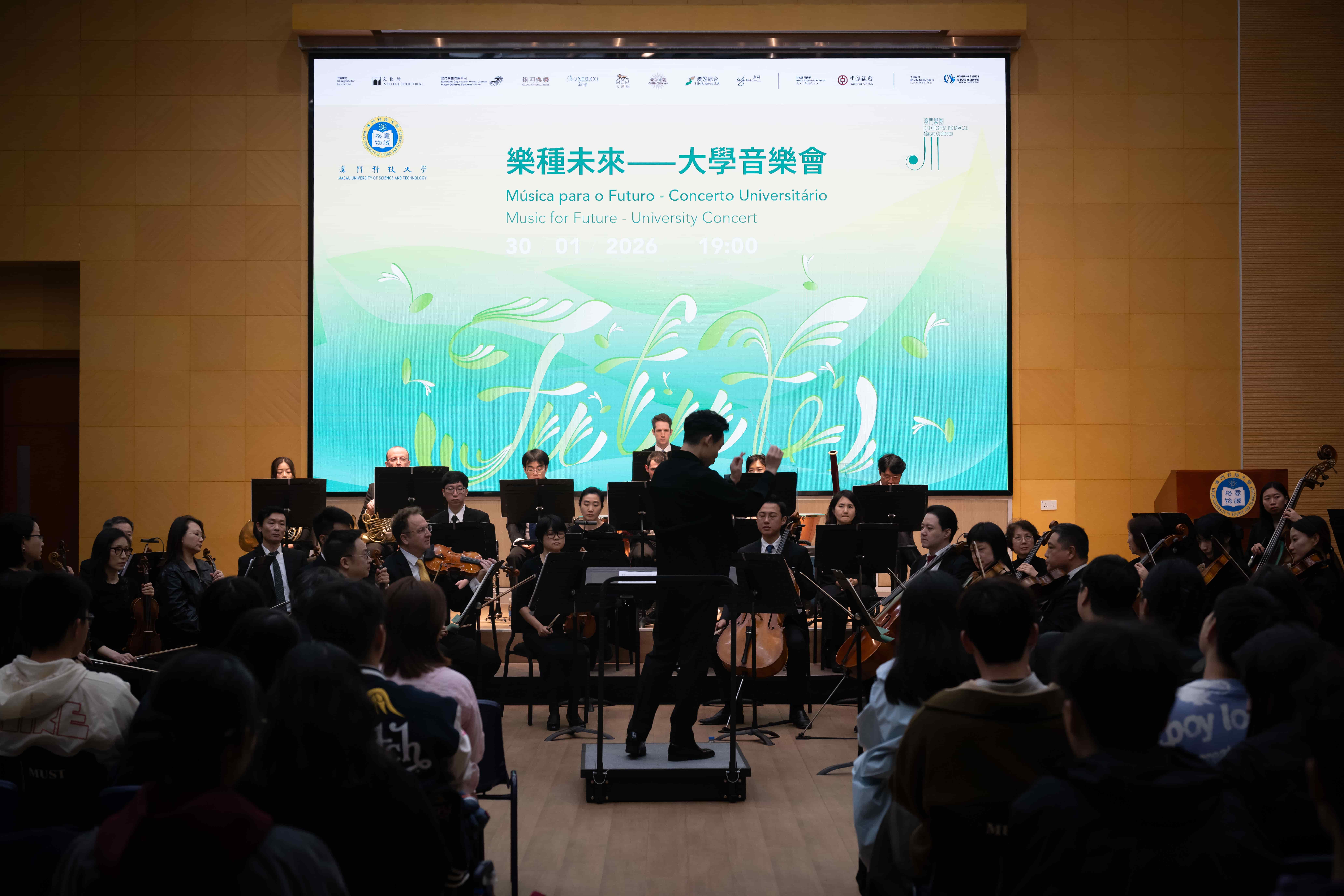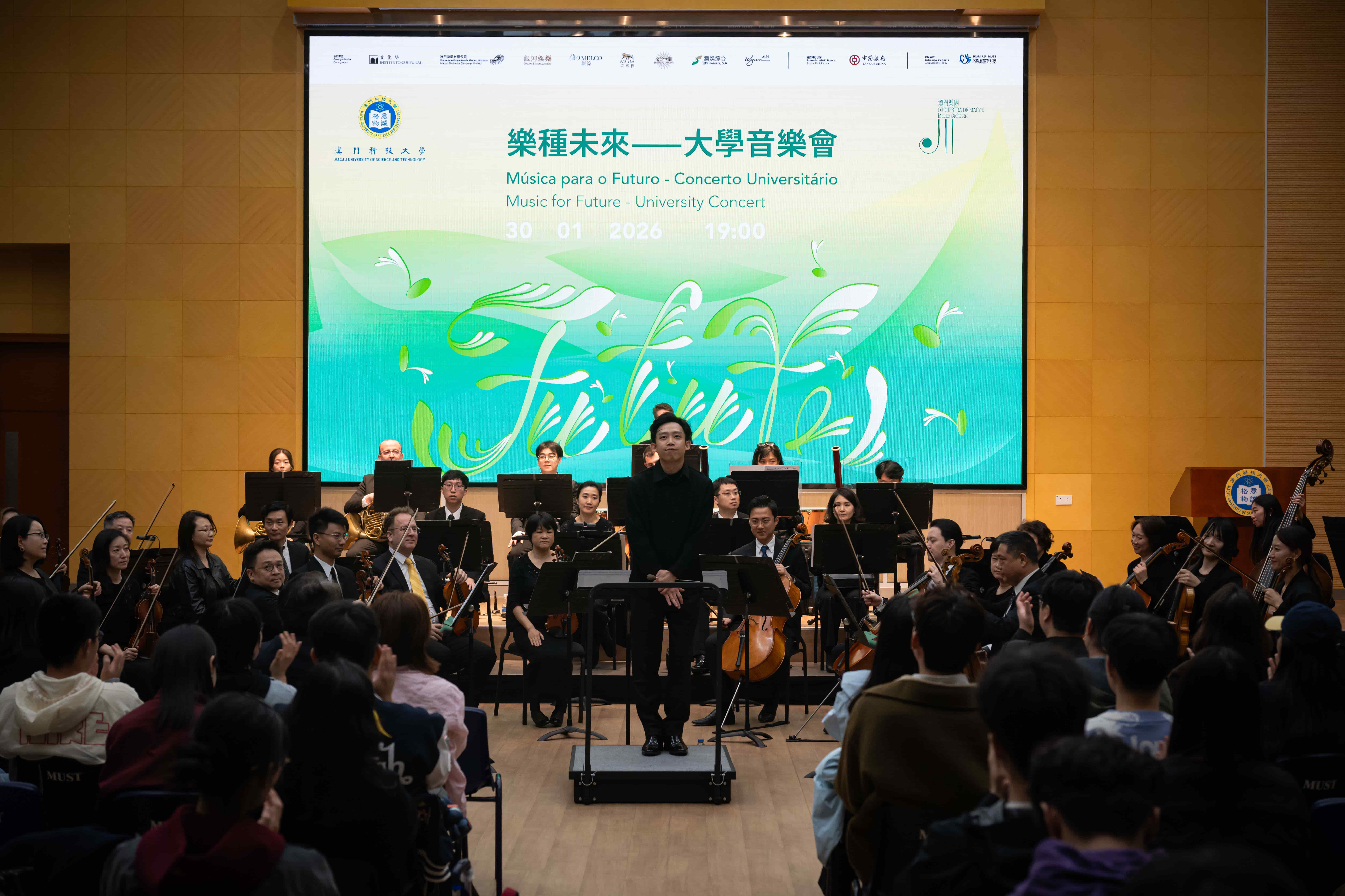 由澳門特區政府文化局、澳門樂團有限公司、銀河娛樂集團、新濠博亞娛樂、美高梅、金沙中國有限公司、澳娛綜合度假股份有限公司、永利渡假村(澳門)股份有限公司共同合辦,澳門科技大學文體發展辦公室支持的校園音樂欣賞之澳門樂團大學音樂會「樂種未來」,於 2026 年 1 月 30 日在澳門科技大學 N101 大禮堂順利舉行。