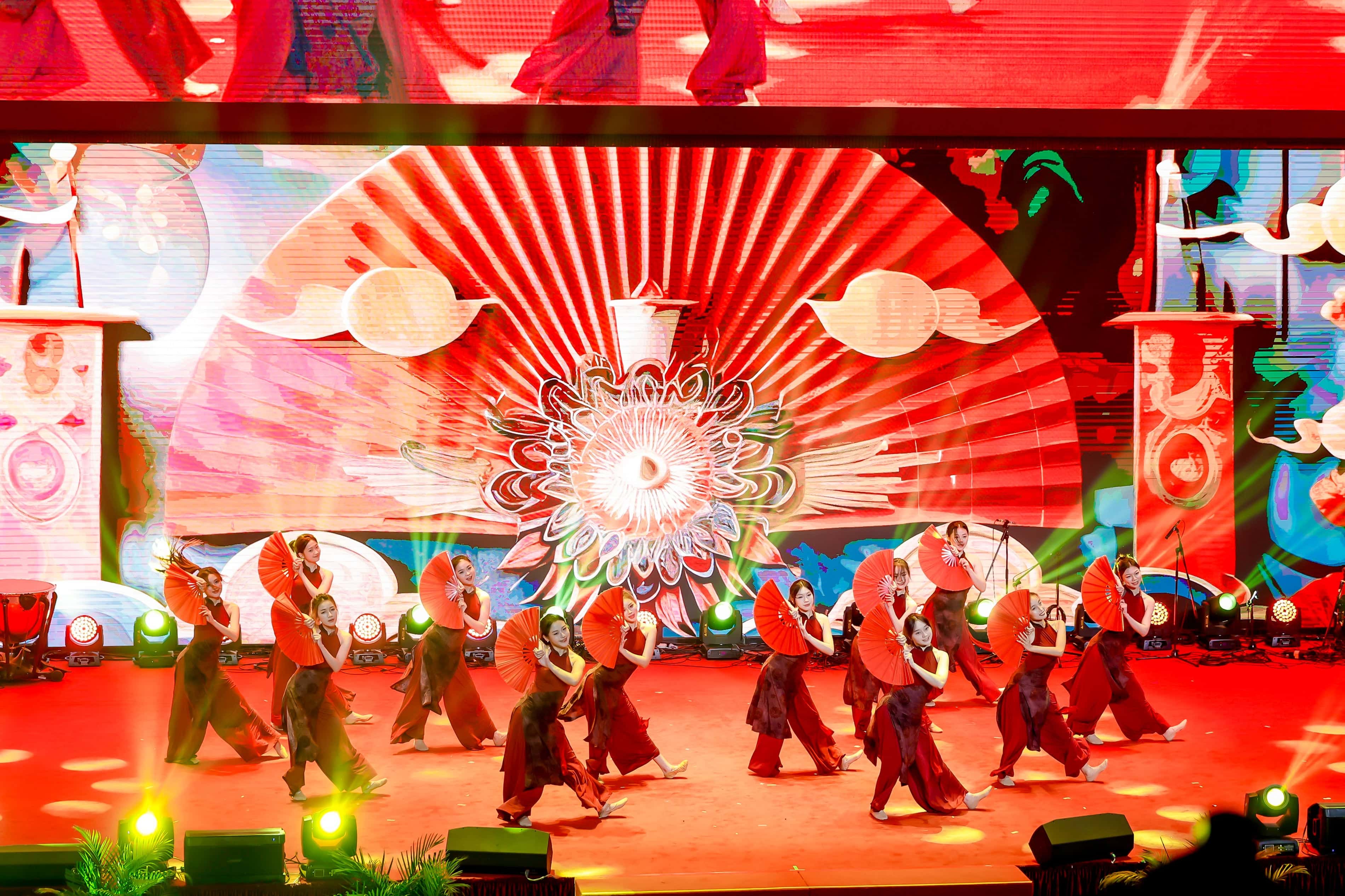 《相亲相爱》温暖登场,合唱团真挚的歌声与民族舞蹈队柔美的舞姿相互映衬,呈现团结互助、守望相依的温馨画面。健美操队再度亮相,演绎《舞扇丹心》,扇影流转、刚柔并济,抒发赤诚初心与奋斗精神,赢得观众阵阵掌声。