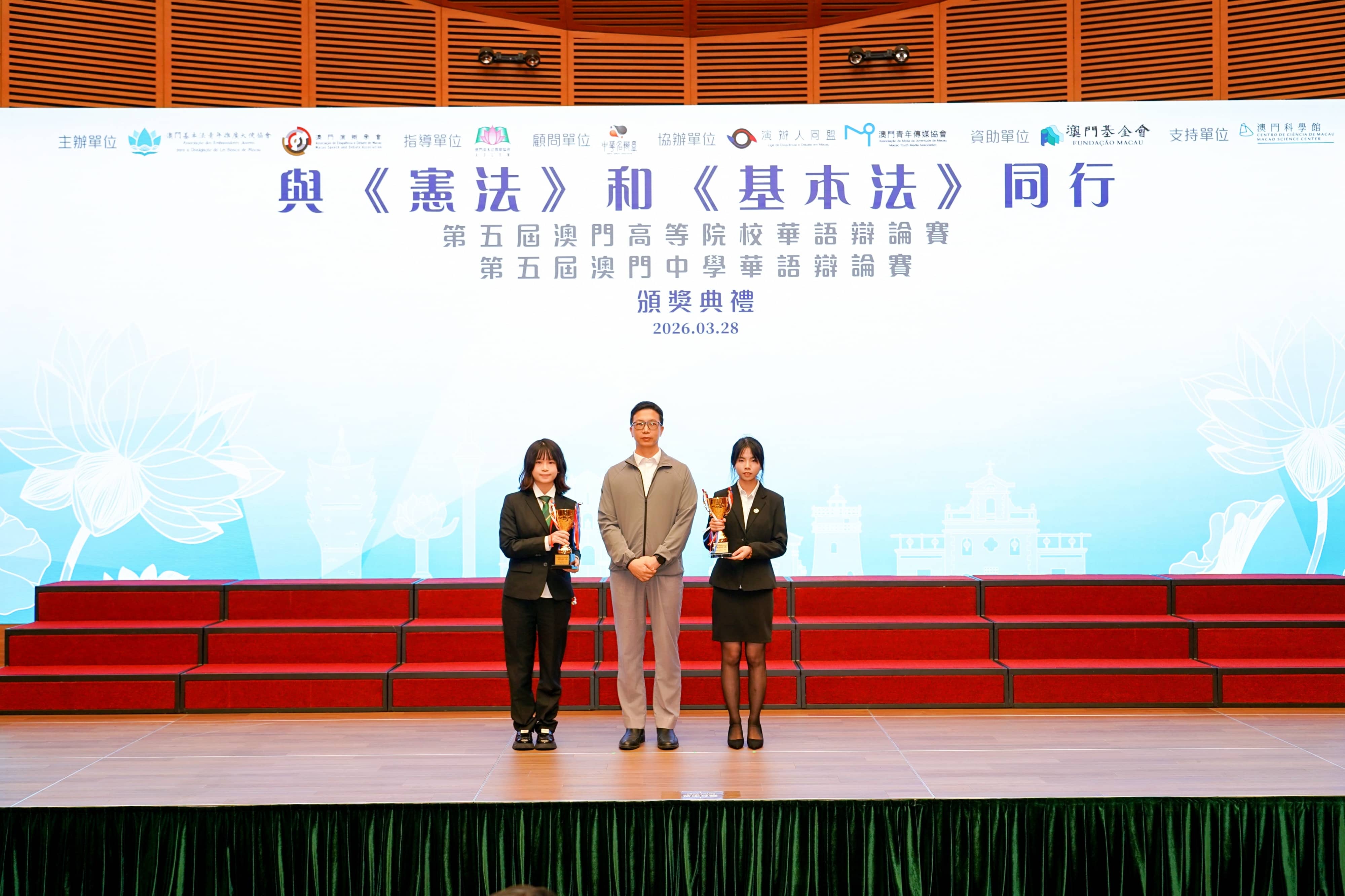 由澳门基本法青年推广大使协会、澳门演辩学会联合主办的「与《宪法》和《基本法》同行 —— 第五届澳门高等院校华语辩论赛」广东话组决赛于3月28日在科学馆圆满落下帷幕。本届赛事旨在引导高校青年深入理解《宪法》与《基本法》的核心精神,进一步提升法治素养与思辨能力。