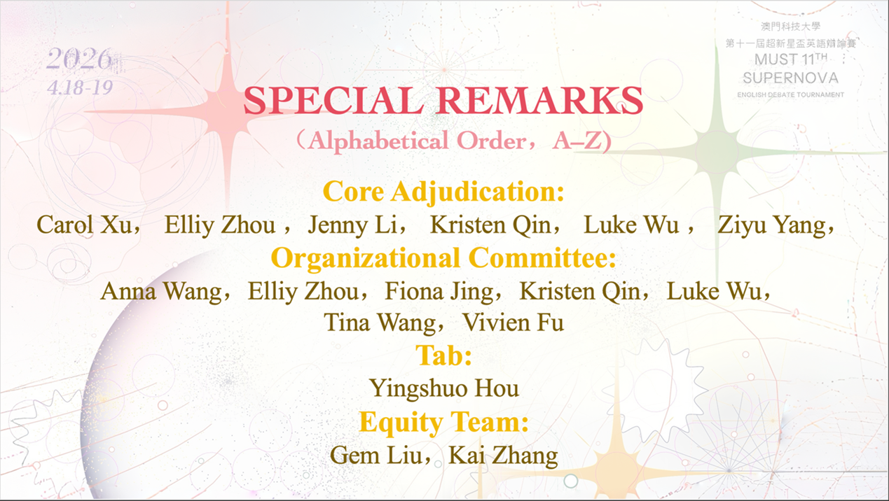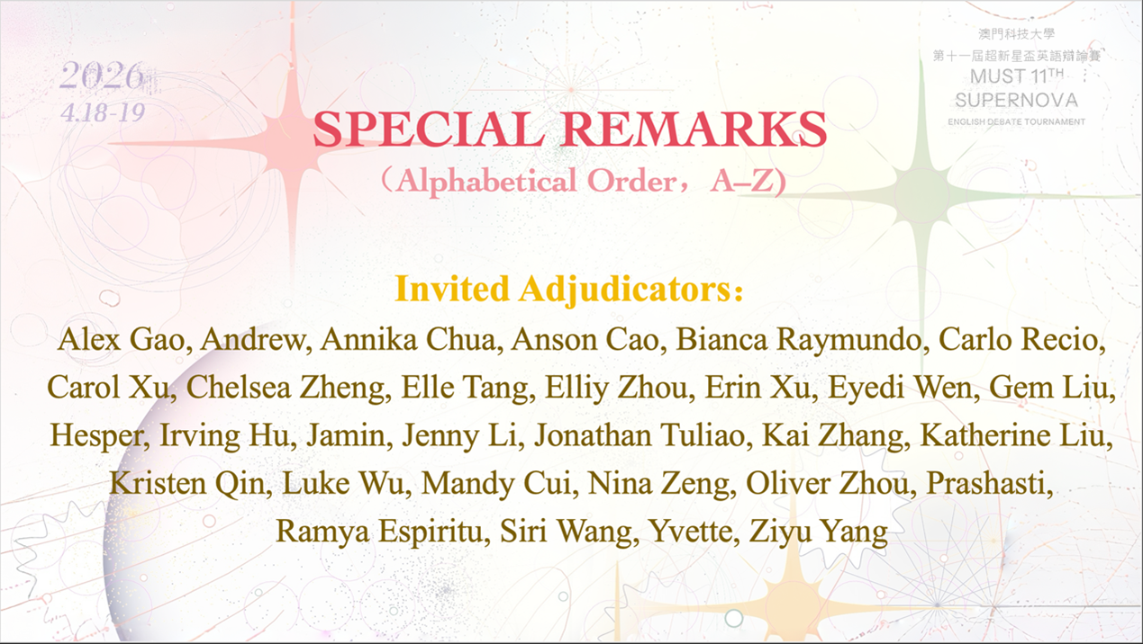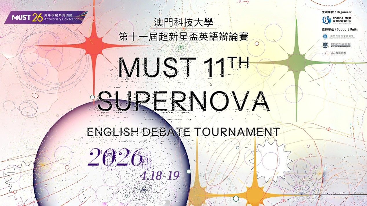 由澳门科技大学文体发展办公室主办的澳门科技大学 26 周年校庆系列活动之 —— 「第十一届超新星杯英语辩论赛」(以下简称超新星杯)于 2026 年 4 月 18 至 19 日在线上顺利举行。作为一个非营利性、以新手友好为宗旨的国际英语辩论赛事,超新星杯始终秉持「让高品质辩论触手可及,以思辨之力拓宽认知边界」的初心。在其迎来第十一届之际,吸引了来自加州大学圣地牙哥分校、香港大学、香港中文大学、北京大学、北京外国语大学、上海外国语大学、中山大学、澳门大学、澳门城市大学等高校在内的 68 支顶尖辩论队伍同场竞技,激荡出丰富而精彩的思想火花。