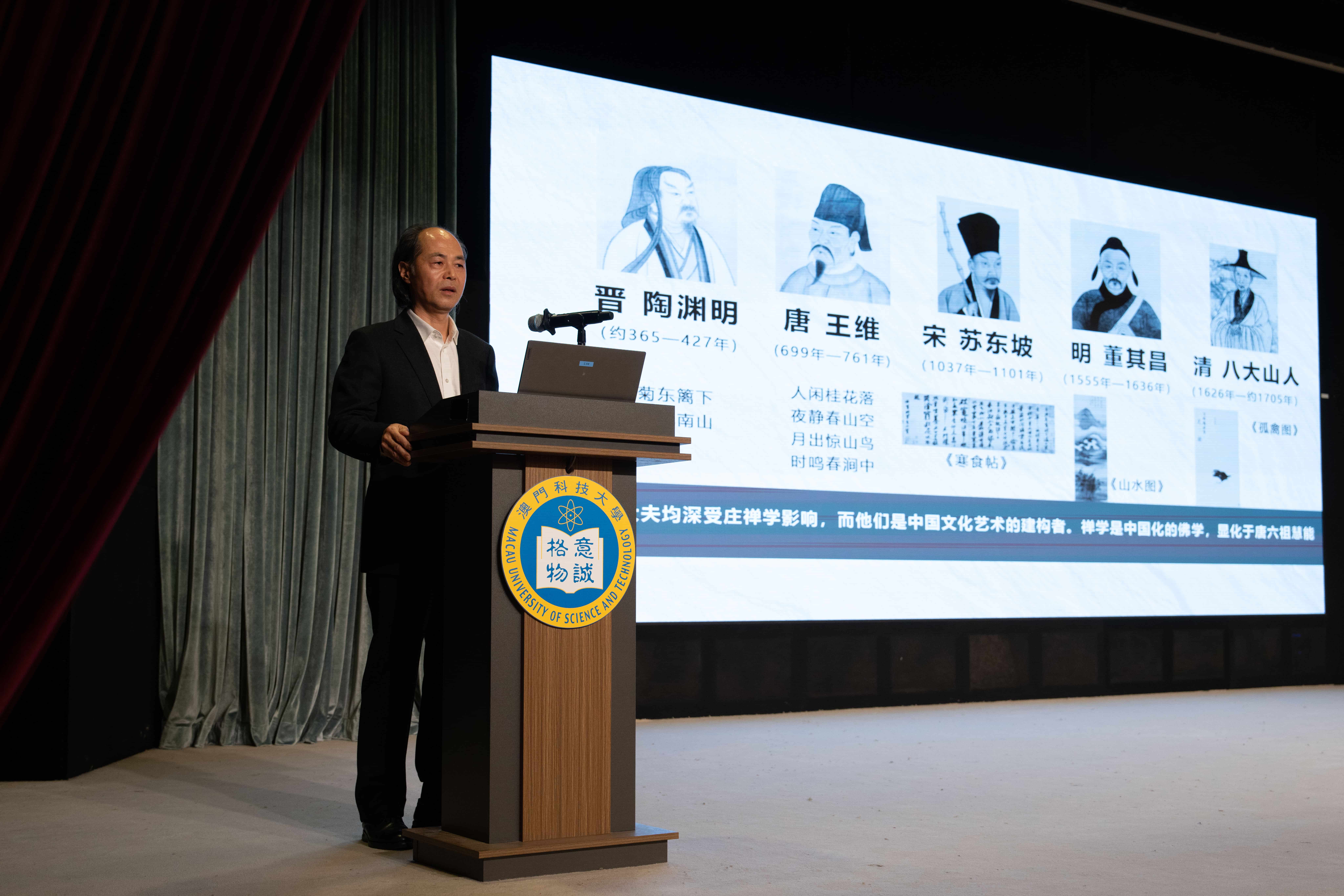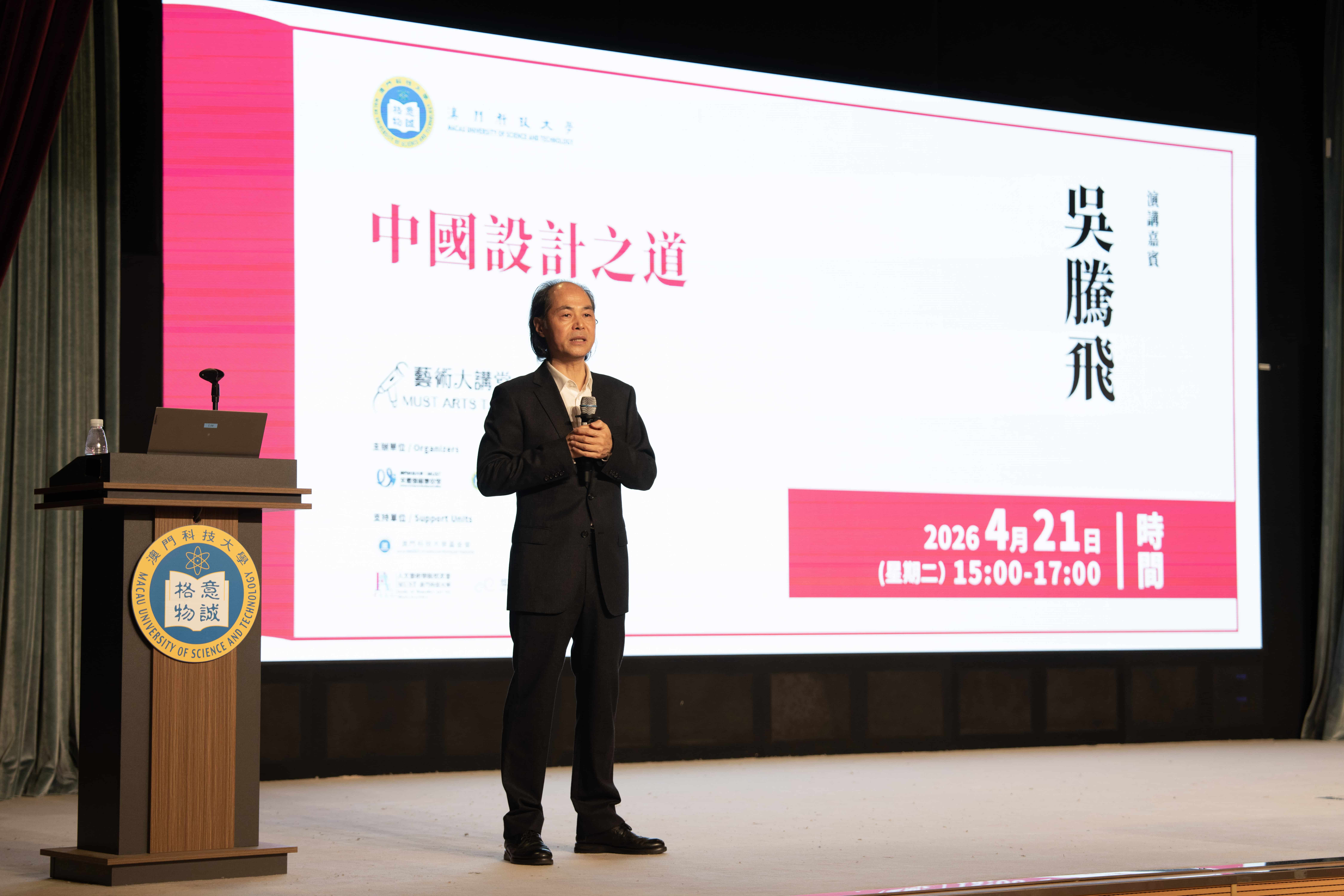 由澳门科技大学文体发展办公室与人文艺术学院主办的「艺术大讲堂」系列讲座之「中国设计之道」,于 2026 年 4 月 21 日下午在澳门科技大学 D 座礼堂顺利举办。本场讲座特邀中国木雕艺术大师、大国工匠、正高级工艺美术师,南京林业大学设计学院客座教授、中南林业科技大学硕士生导师,东阳市红木家具设计研究所所长,「大清翰林」品牌创始人吴腾飞担任主讲嘉宾。